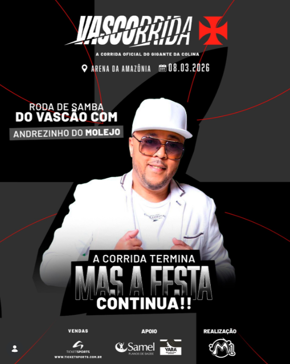 Manaus (AM) – A Vascorrida 2026 – edição Manaus vai além do asfalto: além de ser uma das provas mais aguardadas do calendário esportivo da região, o evento assinado pela M1 Eventos traz uma atração cultural imperdível para fechar o domingo com chave de ouro. No dia 8 de março, após a chegada dos corredores e famílias na Arena da Amazônia, o músico Andrezinho Silva – ícone do pagode carioca e integrante histórico do grupo Molejo – assume o palco para comandar a Roda de Samba do Vascão, prometendo fazer a Arena tremer com um repertório repleto de energia, nostalgia e pagode.
