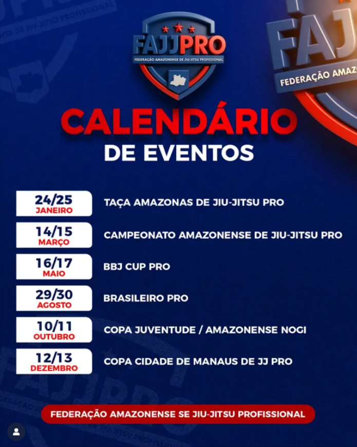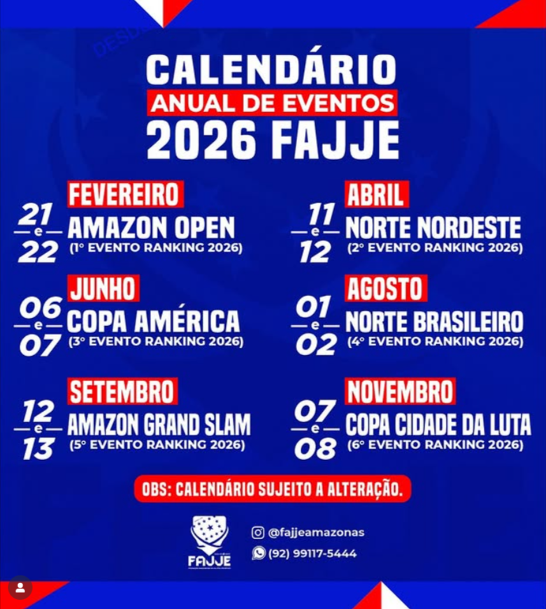 Duas entidades do jiu-jítsu do Amazonas, a Federação Amazonense de Jiu-Jítsu Profissional (FAJJPRO), gestão Fernando Barros e Albert Souza, e a Federação Amazonense de Jiu-Jítsu Esportivo (FAJJE), presidida por Luís Neto, divulgaram oficialmente seus calendários de competições para a temporada 2026, que juntos somam 12 grandes eventos ao longo do ano.