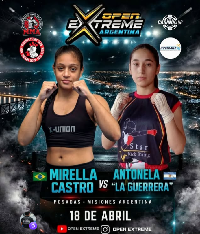 Mirella Castro, a “Jungle Angel”, vai enfrentar a argentina Antonela “La Guerrera” Mendez pela modalidade Lowkick até 50 kg. Com apenas 15 anos, a manauara é atleta da Team X-Union (Rodrigo Fogaça) e do CT Brunocilla de Luta Livre e vem despontando no Kiboxing. Além disso, estreou no MMA no dia 30 de janeiro deste ano no evento BRTL Fight Combat – edição João Pessoa, com triunfo sobre Ewelyn Victória pelo peso palha (até 52 kg).