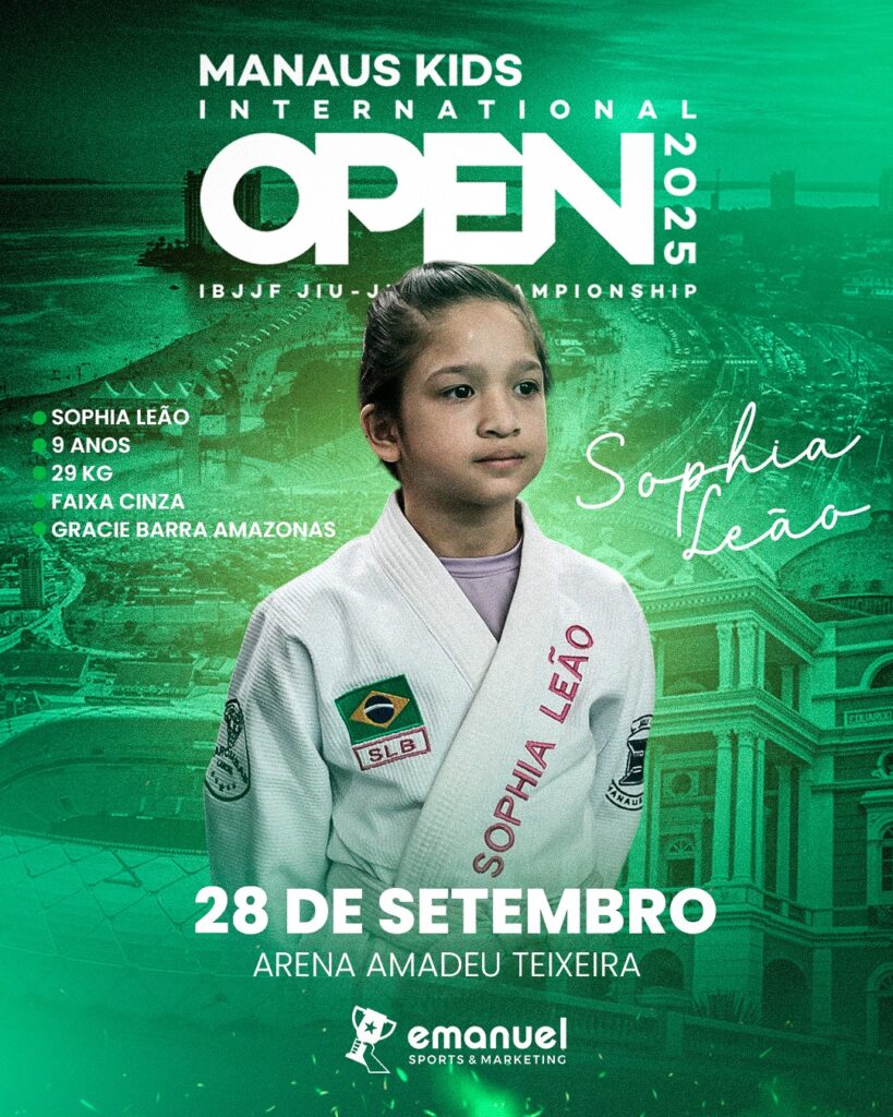 Uma das promessas da nova geração da arte suave amazonense, a lutadora Sophia Leão, de 9 anos, é uma das atletas confirmadas no Manaus Kids International Open de Jiu-Jitsu da IBJJF  2025, que desembarca em Manaus no dia 28 de setembro. O evento acontece na Arena Poliesportiva Amadeu Teixeira.